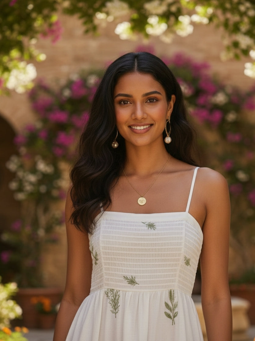 The Mediterranean Breeze Maxi Dress is designed in a soft ivory base with delicate botanical embroidery, evoking sunlit courtyards and slow summer afternoons. An effortless silhouette balanced by subtle structure, this piece is made for warm climates and understated elegance.
