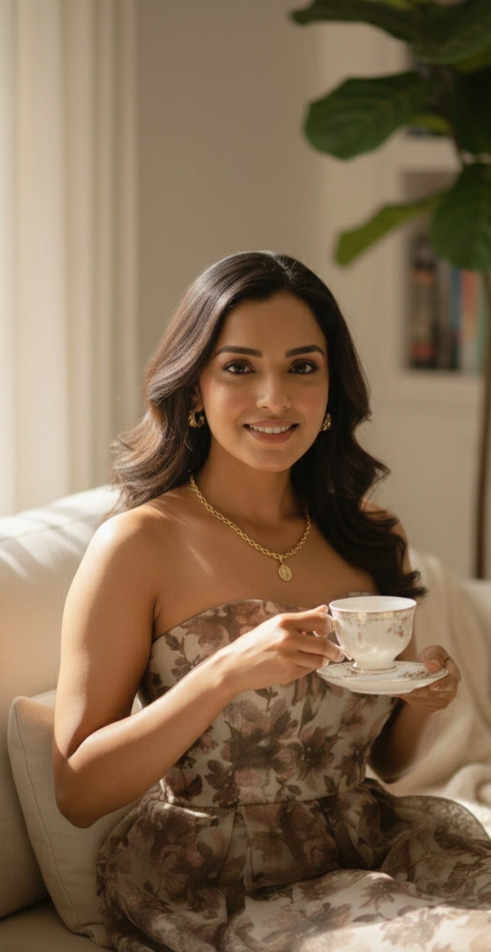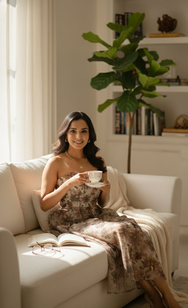 The Serene Meadow Strapless Midi Dress is crafted in a soft earth-toned floral chiffon, balancing lightness with structure. Designed for elegant daytime occasions and intimate celebrations, it moves with an effortless grace that feels both modern and timeless.